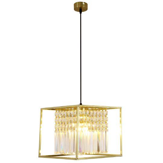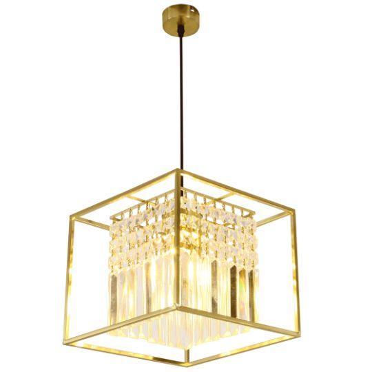 This statement pendant light features a bold geometric frame paired with cascading crystal elements that catch and reflect light beautifully. Its structured silhouette creates a striking balance between modern design and timeless elegance. Ideal for living rooms, dining areas, or entryways, it adds depth and visual interest without overwhelming the space. When illuminated, it brings a warm, refined glow that elevates the atmosphere and makes the room feel instantly more luxurious.