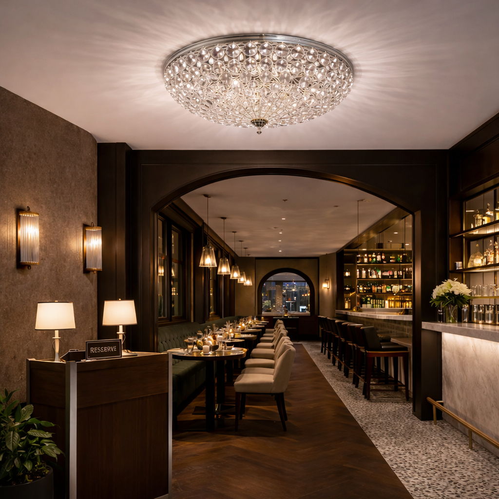 This elegant crystal flush mount ceiling light features a shimmering bowl design filled with layered faceted crystals that beautifully reflect and refract light. The polished chrome frame enhances its glamorous appeal while keeping the profile sleek and ceiling hugging. When illuminated, it creates a warm, sparkling glow that instantly elevates the atmosphere of any room. Perfect for bedrooms, dining areas, hallways, or boutique style spaces, it adds a luxurious statement without overwhelming the ceiling height.