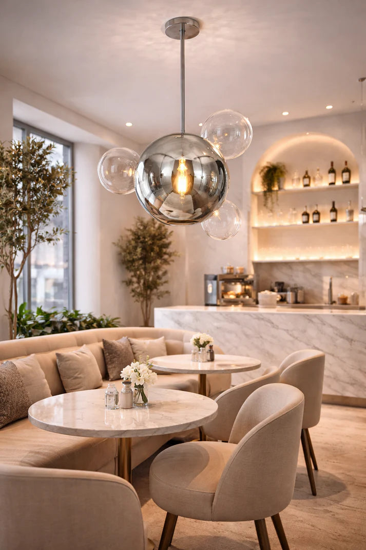 This contemporary pendant light features a sculptural cluster of clear glass or chrome spheres finish that reflects and enhances the surrounding light. The softly diffused glow at its center creates depth and atmosphere while maintaining a light, airy and refined presence. Ideal for dining areas, kitchen islands, statement living spaces, or modern entryways, it adds visual interest without overpowering the interior. The design brings modern sophistication and artistic charm, elevating the space with warmth, elegance, and a confident design-led character.
