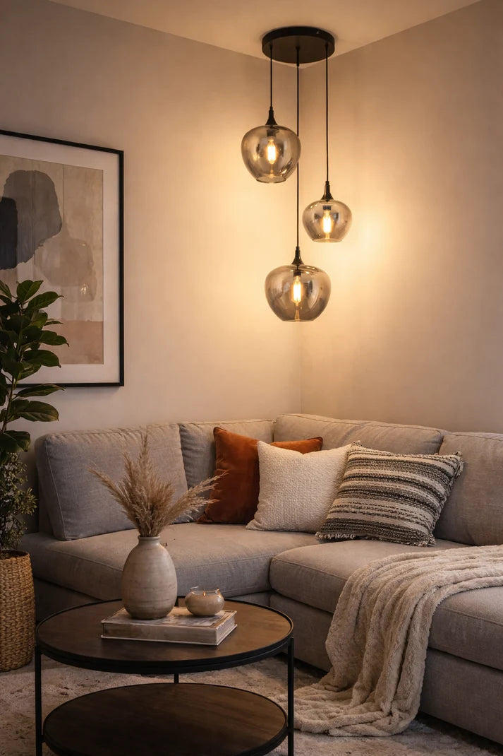 Our modern Edison 3 light pendant features three smoky glass shades suspended at staggered heights from a sleek black ceiling plate, showing off warm filament bulbs like they’re proud of themselves. It suits stairwells, entryways, dining nooks, or corners that need vertical interest. The tiered drop creates a sense of flow and softness, making the space feel taller and more intentional. It brings a cozy, contemporary glow effortlessly.