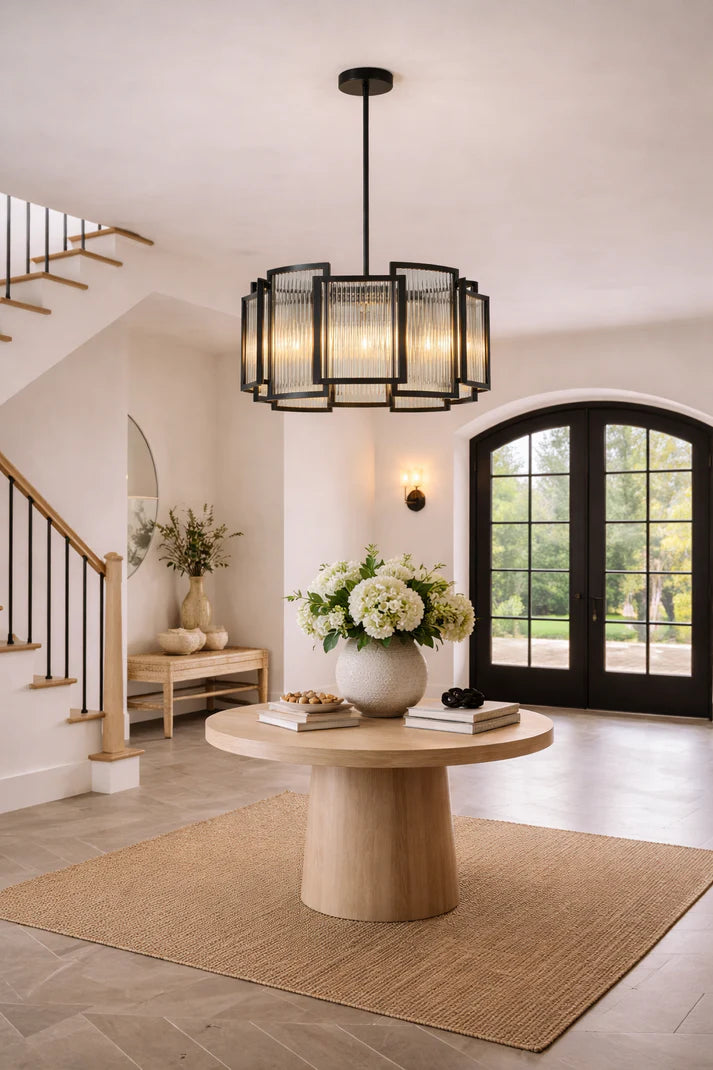 This elegant pendant features a sculptural arrangement of ribbed glass panels, creating a striking balance of texture and structure. The layered glass softly diffuses light, producing a warm, ambient glow that enhances the space without overwhelming it. Ideal for dining rooms, entry foyers, or statement living areas, it brings a sense of architectural sophistication and modern luxury. The design adds depth, presence, and a timeless elegance, elevating interiors with a confident yet graceful character.