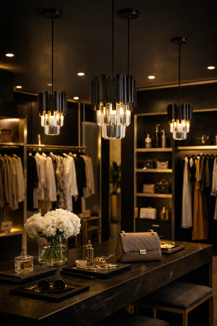 This pendant light showcases a bold, sculptural design with matte black vertical fins framing faceted clear glass panels. The layered glass softly diffuses light, creating depth and a warm, elegant glow. Suspended from a sleek black cord with a matching canopy, it’s a striking choice for kitchens, dining areas, or entryways, adding a refined contemporary touch.