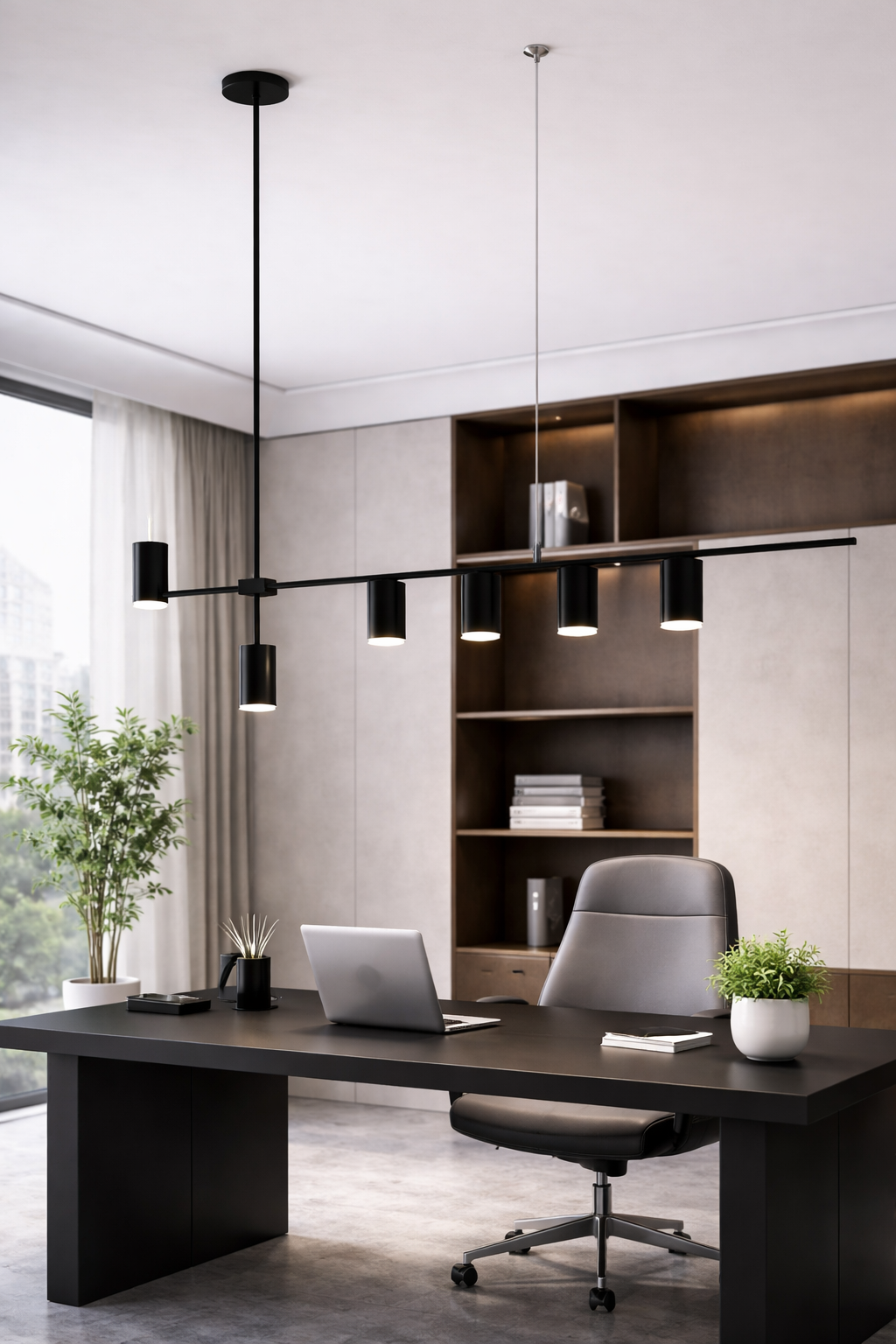 This sleek linear pendant light features a modern, minimalist design with evenly spaced cylindrical shades that create a clean architectural look. It’s ideal for dining tables, kitchen islands, or contemporary office spaces where balanced, focused lighting is needed. The fixture adds a refined, high-end feel while keeping the space visually open and uncluttered. Available in a classic black finish as well as a satin brass variant for a warmer, more luxurious touch.