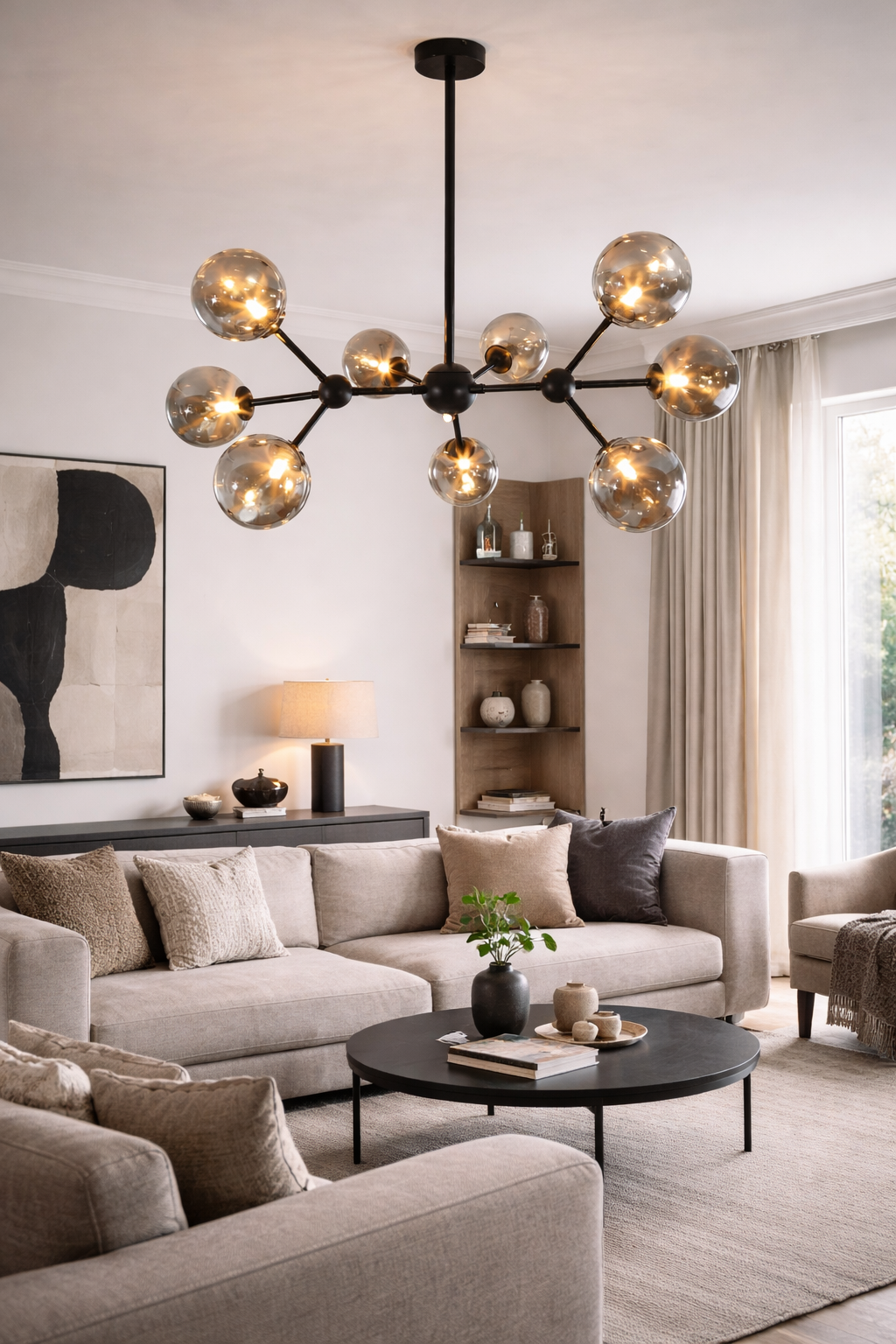 This striking chandelier features a sculptural, multi-arm design that creates a balanced and modern silhouette. Each globe softly diffuses light to produce a warm, inviting glow while adding visual depth and character to the fixture. Its contemporary form makes it an ideal centrepiece for dining rooms, living spaces, or stylish entryways. The design brings a sense of sophistication and atmosphere, transforming any room into a refined and welcoming setting.