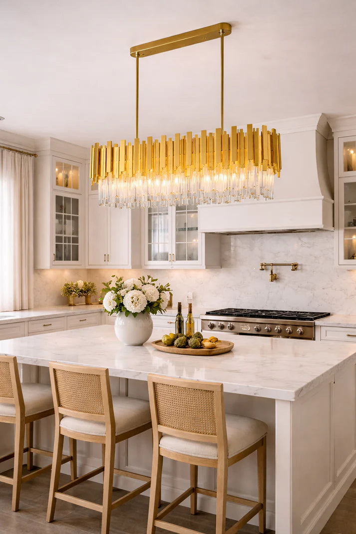 This luxurious chandelier light showcases a striking arrangement of vertical gold-toned elements paired with clear crystal detailing, creating a refined interplay of texture and light. The layered design allows illumination to cascade beautifully, casting a warm, radiant glow that feels both opulent and balanced. Ideal above dining tables, statement kitchen islands, or in grand living spaces, it becomes an instant focal point. The light brings a sense of glamour and elegance, enriching the interior with depth, warmth, and timeless sophistication.
