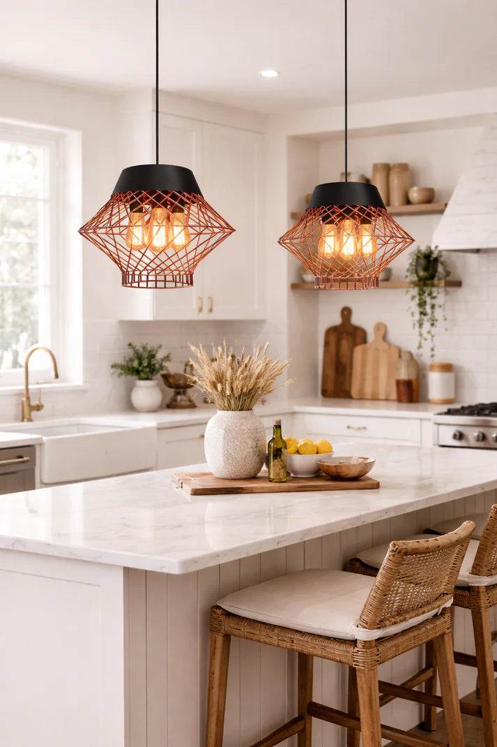 This pendant light features a sculptural wire design, crowned with a refined matte black top for a contemporary contrast. The open design allows light to glow freely, casting intricate shadows and creating a sense of depth and warmth. Perfectly suited above dining tables, kitchen islands, or intimate living spaces, it adds a distinctive artistic presence without overwhelming the room. The light brings character, texture, and a softly dramatic elegance, enriching the space with warmth and modern charm.