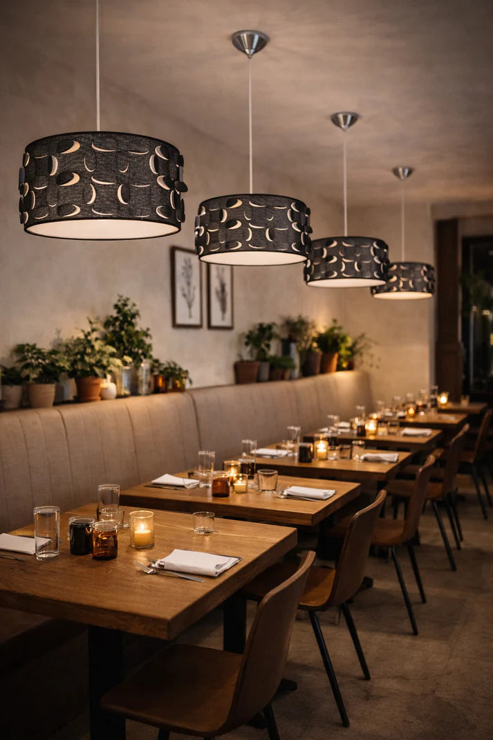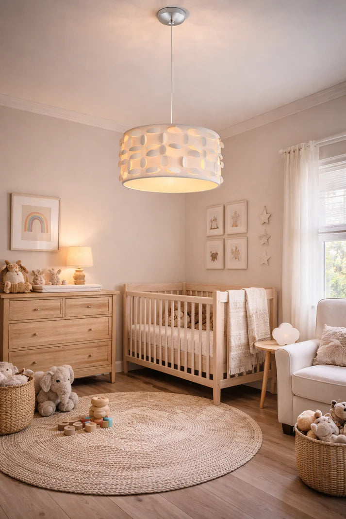 This pendant light features a soft, rounded drum shade with an elegant cut-out pattern that allows light to gently glow through, creating a warm and inviting ambience. The layered design adds subtle texture and visual interest, while the diffused light provides a comfortable, even illumination. Suspended from a clean cord with a simple ceiling mount, this pendant is ideal for living areas, bedrooms, dining spaces, or stylish commercial interiors where a refined yet relaxed lighting solution is desired.