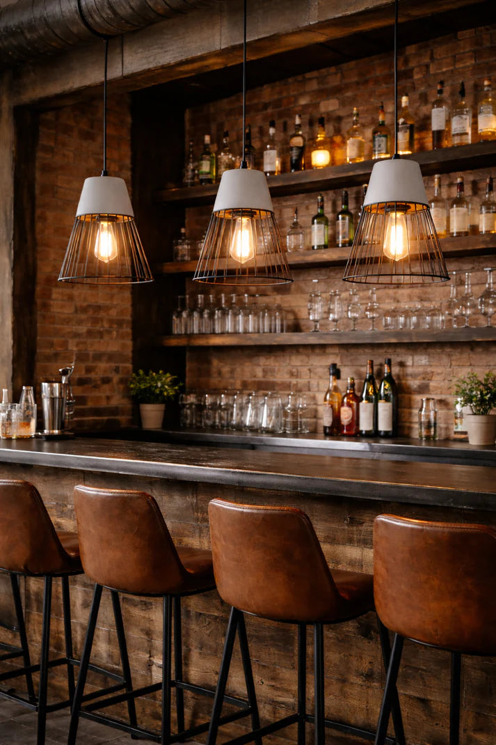 This stylish pendant light features a clean, open cage design paired with a smooth concrete shade, creating a refined balance of industrial and contemporary style. The exposed filament bulb casts a warm, inviting glow, adding depth and character to the space. Perfect above kitchen islands, dining tables, or modern living areas, it brings understated texture and a relaxed sophistication to the interior.