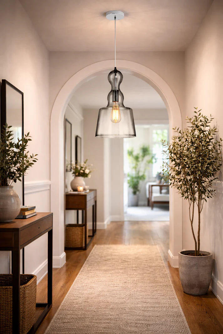 This pendant light features a sculptural, bell-shaped glass shade with a refined silhouette that adds character and elegance to any space. The transparent form allows the filament bulb to remain visible, creating a warm and inviting glow while highlighting the light’s distinctive shape. Suspended from a slim cord with a clean ceiling canopy, this pendant is ideal for kitchens, dining areas, bedside lighting, or stylish commercial interiors, offering a timeless design that blends effortlessly into both modern and classic settings.