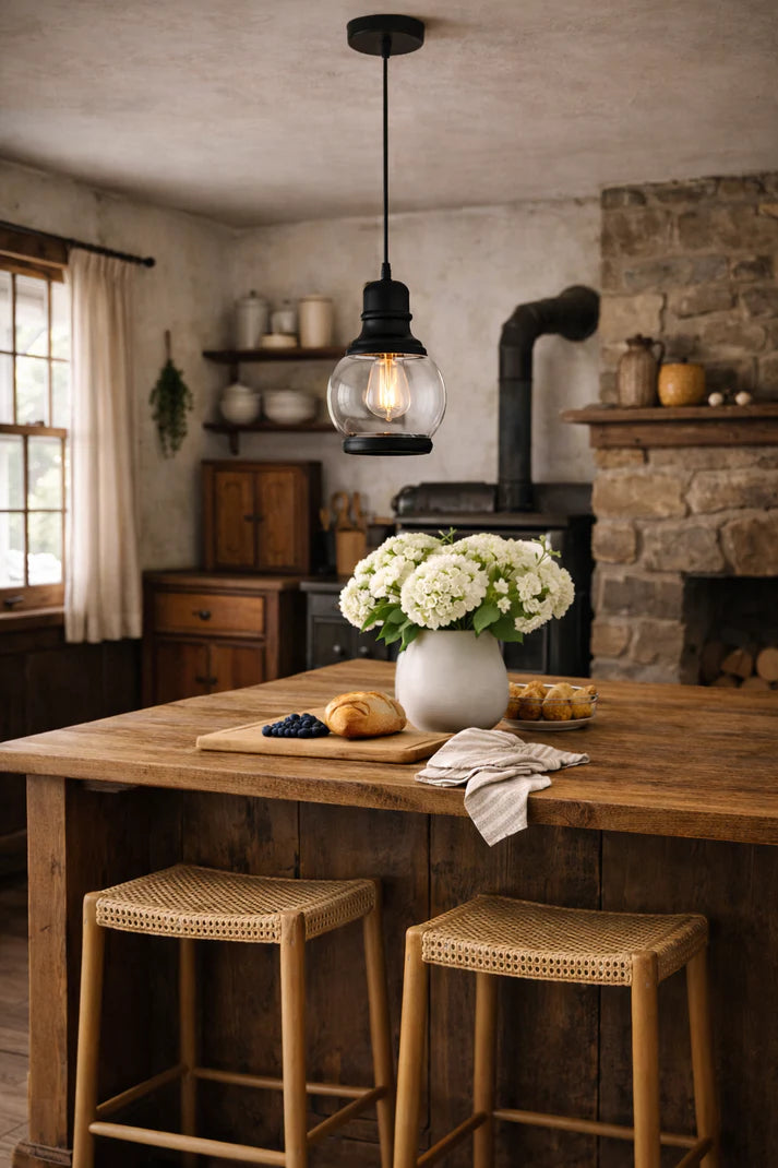 This pendant light features a classic silhouette with a clear glass shade that softly showcases the bulb within. Its timeless design brings character and warmth without feeling heavy or ornate. Perfect for a country farmhouse, it complements rustic timber, stone textures, and cozy interiors beautifully. Ideal over kitchen islands, dining tables, or entryways, it creates an inviting and lived-in atmosphere.