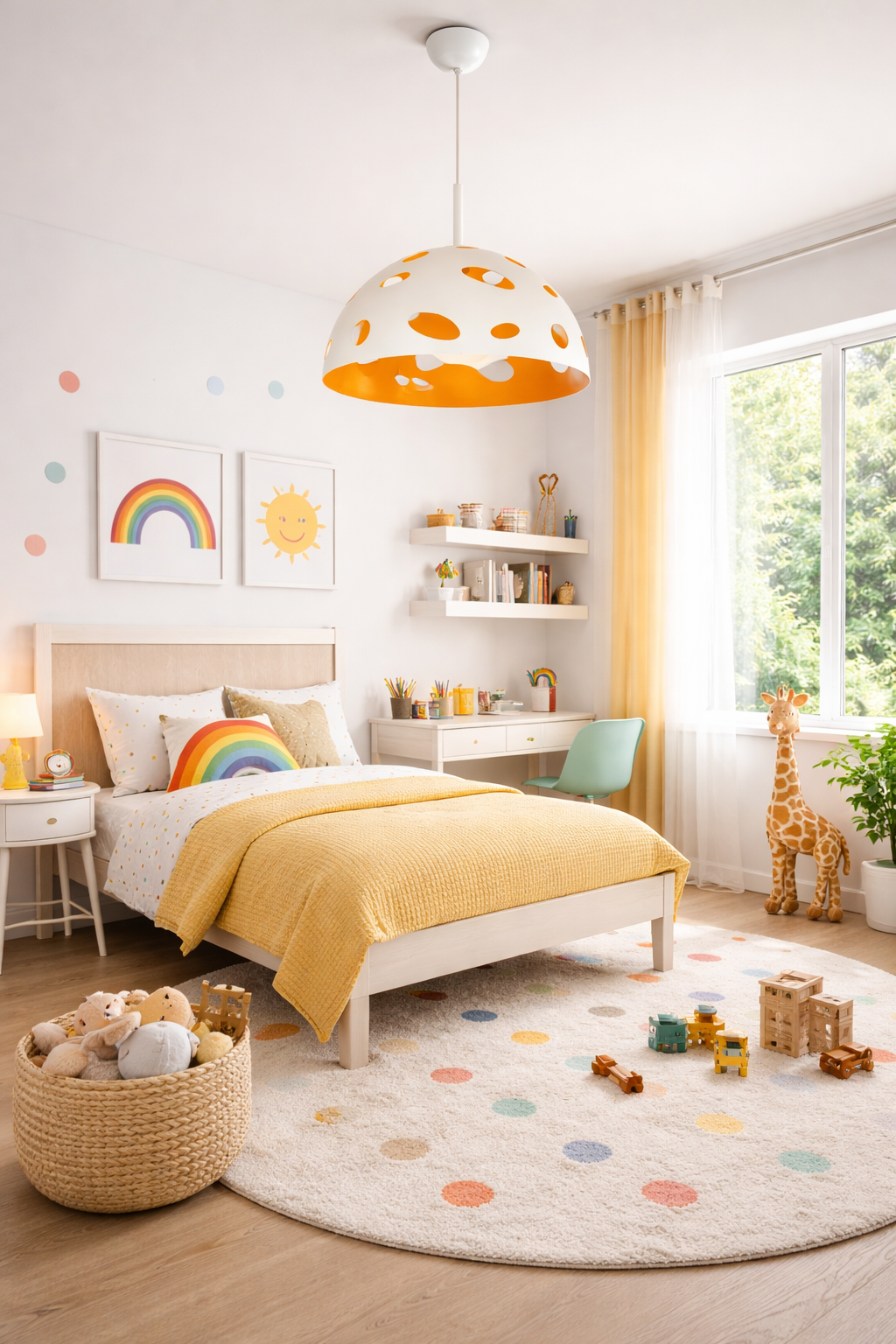 This playful pendant light features a smooth dome shade with cut-out circular details and a warm contrasting interior finish. The perforated design allows light to glow through softly, creating a fun pattern and a cozy ambience. Its modern yet whimsical look makes it perfect for kitchens, dining areas, or creative spaces. The bold shape and color bring personality and warmth while still providing practical illumination.