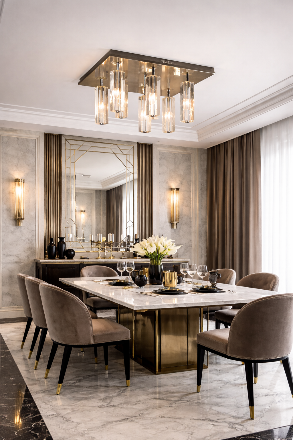 This ceiling light features a sleek rectangular frame with suspended clear glass elements that create a clean yet luxurious look. It suits dining rooms, living areas, or entryways, especially in modern, contemporary, or Art Deco–inspired interiors. The glass softly diffuses light, adding warmth while maintaining a polished, structured feel. It makes a space feel elegant, refined, and visually striking without feeling heavy or overdone.