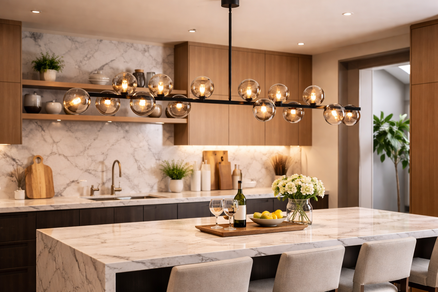 This striking linear pendant creates a refined statement with its balanced arrangement of glowing glass spheres along a sleek horizontal frame. It suits dining tables, kitchen islands, and contemporary living spaces where a sculptural focal point is desired. The design brings a sense of symmetry and modern luxury while maintaining a warm, inviting atmosphere. Its soft illumination enhances the room with both visual interest and ambient elegance.