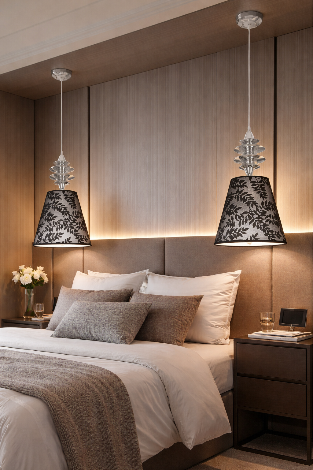 This pendant light blends a soft grey shade with a delicate black leaf pattern and a sleek chrome detail for a modern, elegant look. It looks great over dining tables, kitchen islands, or in a cozy reading nook where you want gentle, focused light. The patterned shade adds visual interest without overwhelming the space. It brings a calm, stylish atmosphere and a touch of contemporary charm to any room.