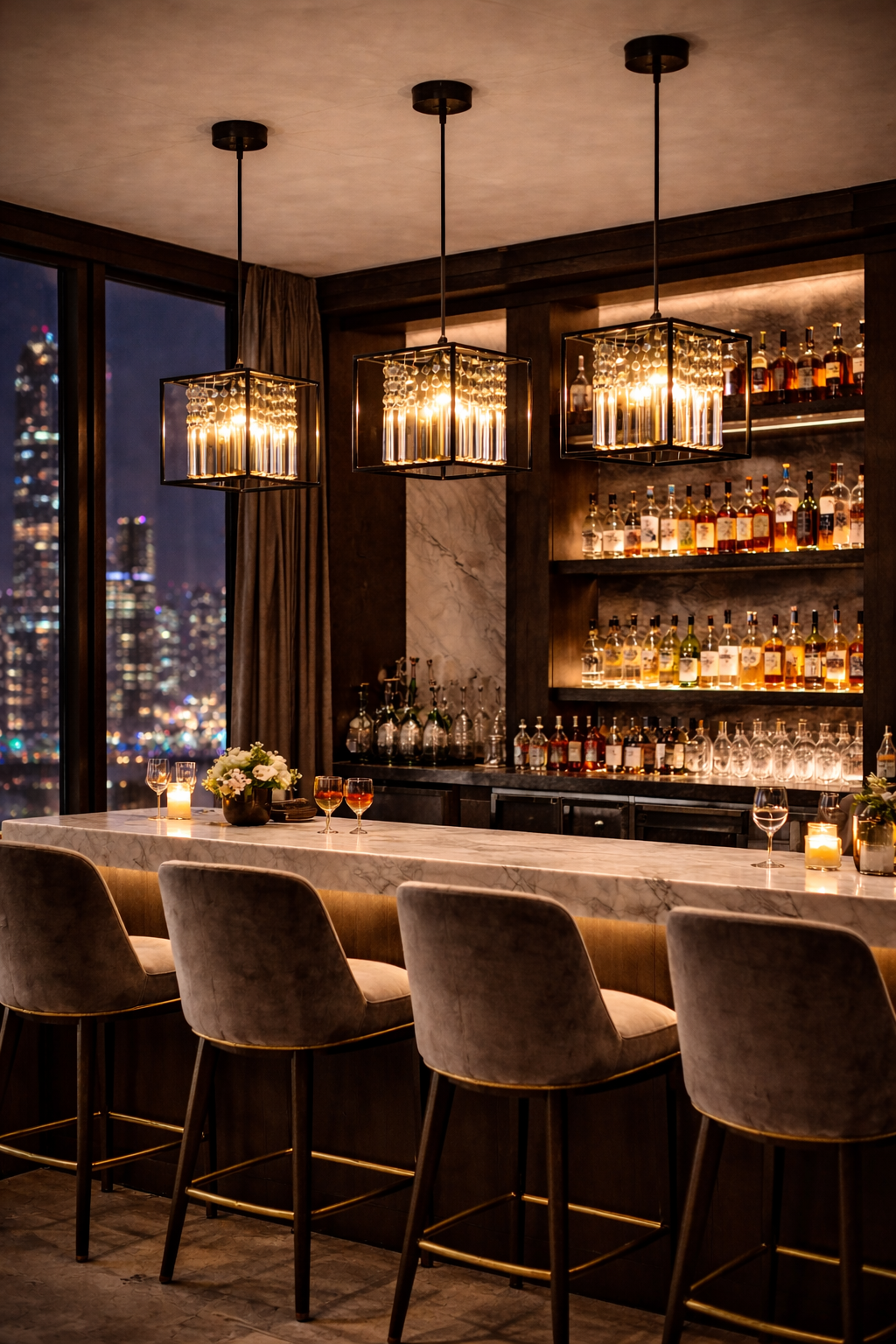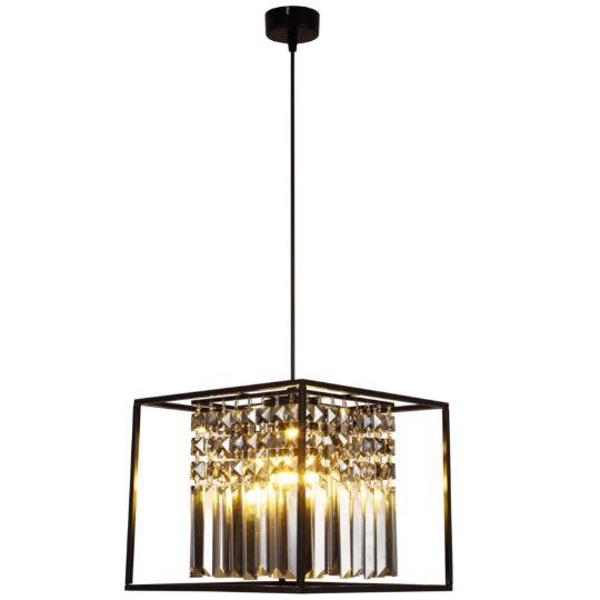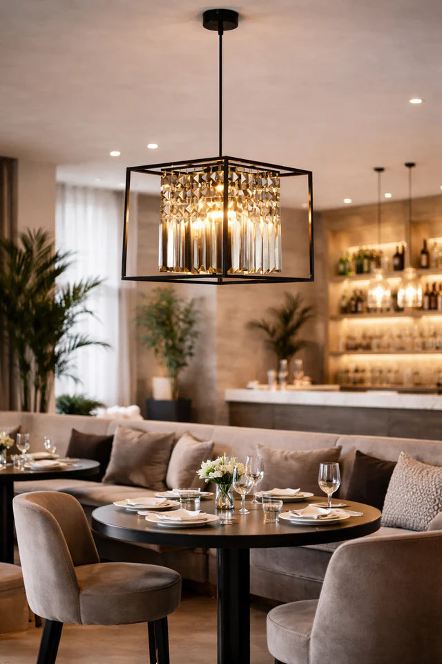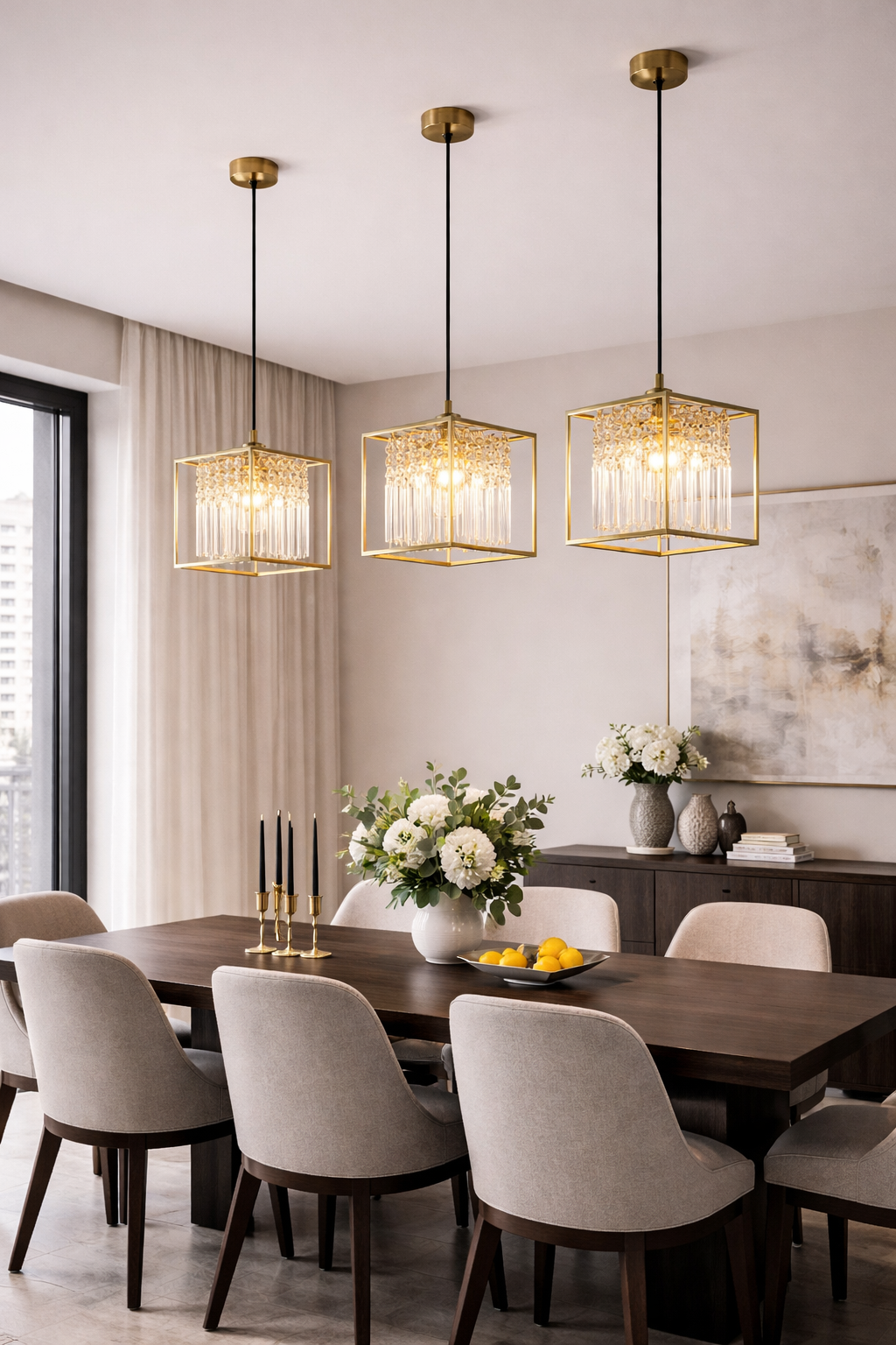 This statement pendant light features a bold geometric frame paired with cascading crystal elements that catch and reflect light beautifully. Its structured silhouette creates a striking balance between modern design and timeless elegance. Ideal for living rooms, dining areas, or entryways, it adds depth and visual interest without overwhelming the space. When illuminated, it brings a warm, refined glow that elevates the atmosphere and makes the room feel instantly more luxurious.