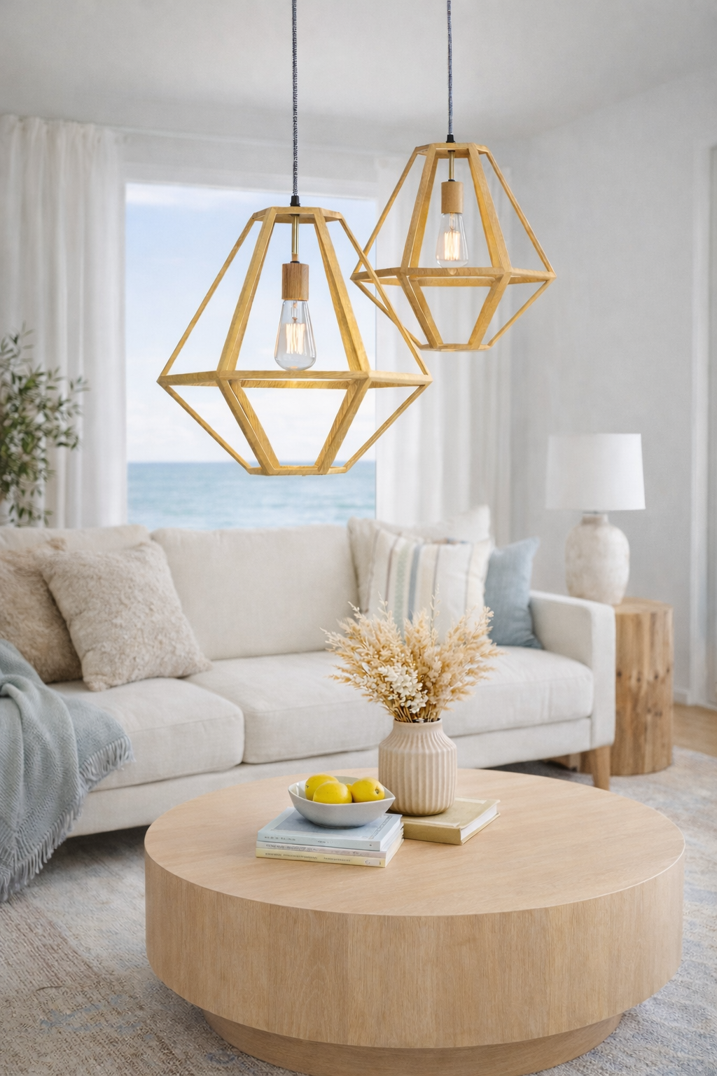 This geometric timber pendant light blends natural warmth with a clean, contemporary silhouette, creating a striking yet airy focal point. Its open-frame design allows light to glow freely, adding softness and depth without visually crowding the space. It suits modern coastal interiors, Scandinavian-style homes, and minimalist kitchens or dining areas beautifully. When used in a room, it brings a relaxed, organic feel while still looking refined and architectural.
