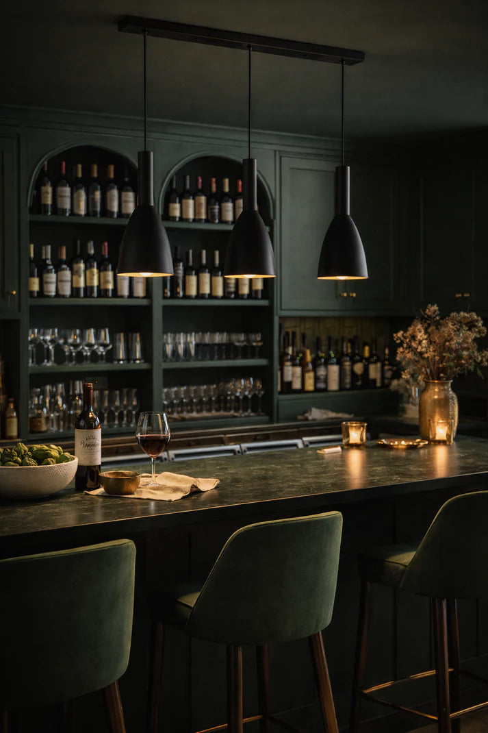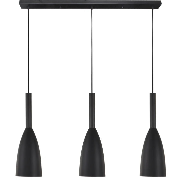 This sleek three-light pendant features a clean, minimalist design with matte cone-shaped shades suspended from a streamlined rectangular canopy. The slender silhouettes create a refined, contemporary look while providing focused, downward illumination. Perfectly suited for kitchen islands, dining tables, or bar areas, this pendant brings balance and symmetry to modern interiors, offering both functional lighting and understated style.