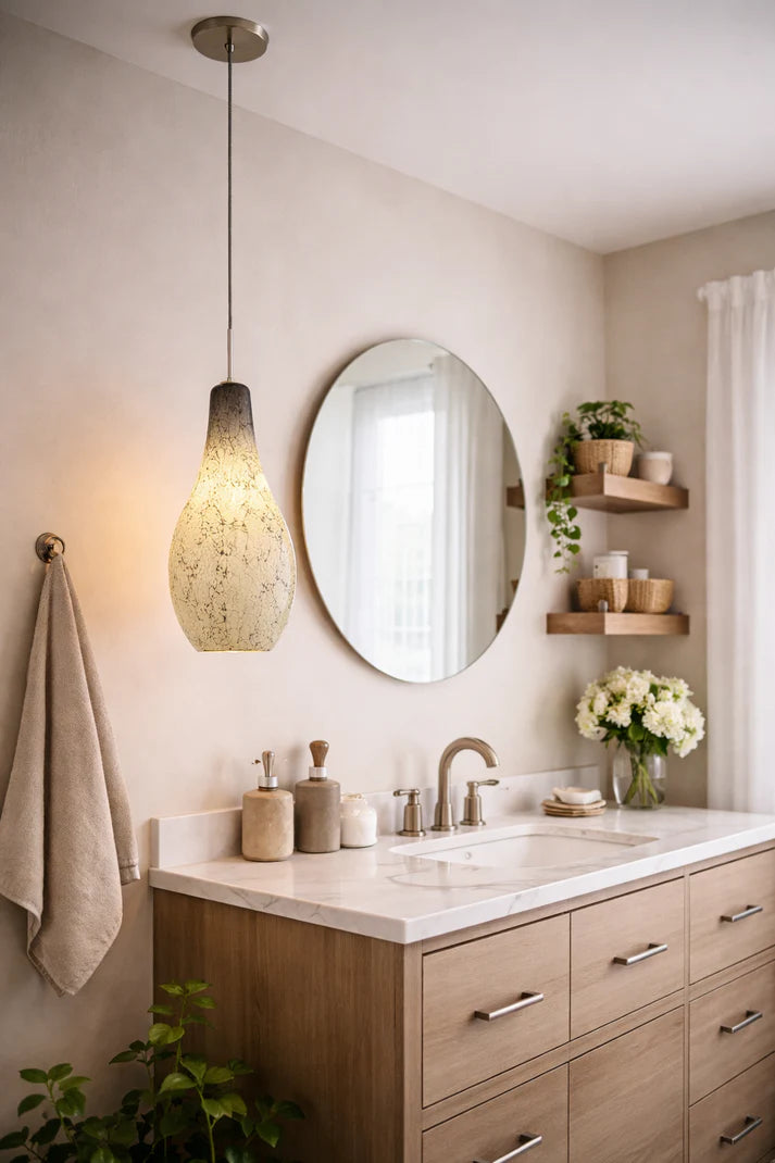 This pendant light features an elegant, elongated glass form with a gently tapered silhouette that creates a soft, sculptural presence. The textured glass diffuses light beautifully, producing a warm and atmospheric glow that adds depth and character to the space. Suspended from a slim cord and simple ceiling mount, this design is ideal for bathroom, kitchen islands, dining areas, bedside lighting, or refined commercial interiors, offering a balance of sophistication and subtle visual interest.