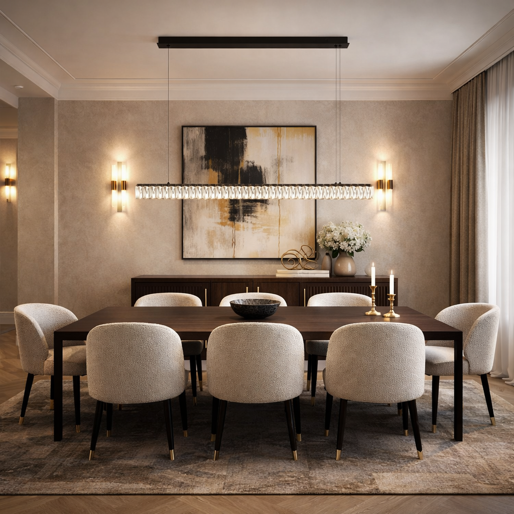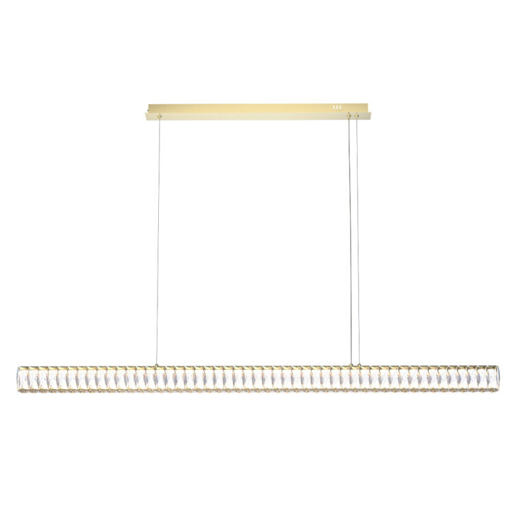 Make a bold design statement with this stunning crystal bar linear pendant, where refined elegance meets modern minimalism. A row of precision cut crystal segments in a integrated LED light bar, casting a warm, luminous glow that refracts beautifully across any space. Suspended from a sleek rectangular ceiling canopy by twin adjustable cables, this pendant is perfectly proportioned to hang above a dining table, kitchen island, or in an expansive entryway. Available in both brushed gold and matte black finishes, it effortlessly complements a range of interior styles. It adds a touch of luxury to your home with a light that's as much a work of art as it is a functional centerpiece.