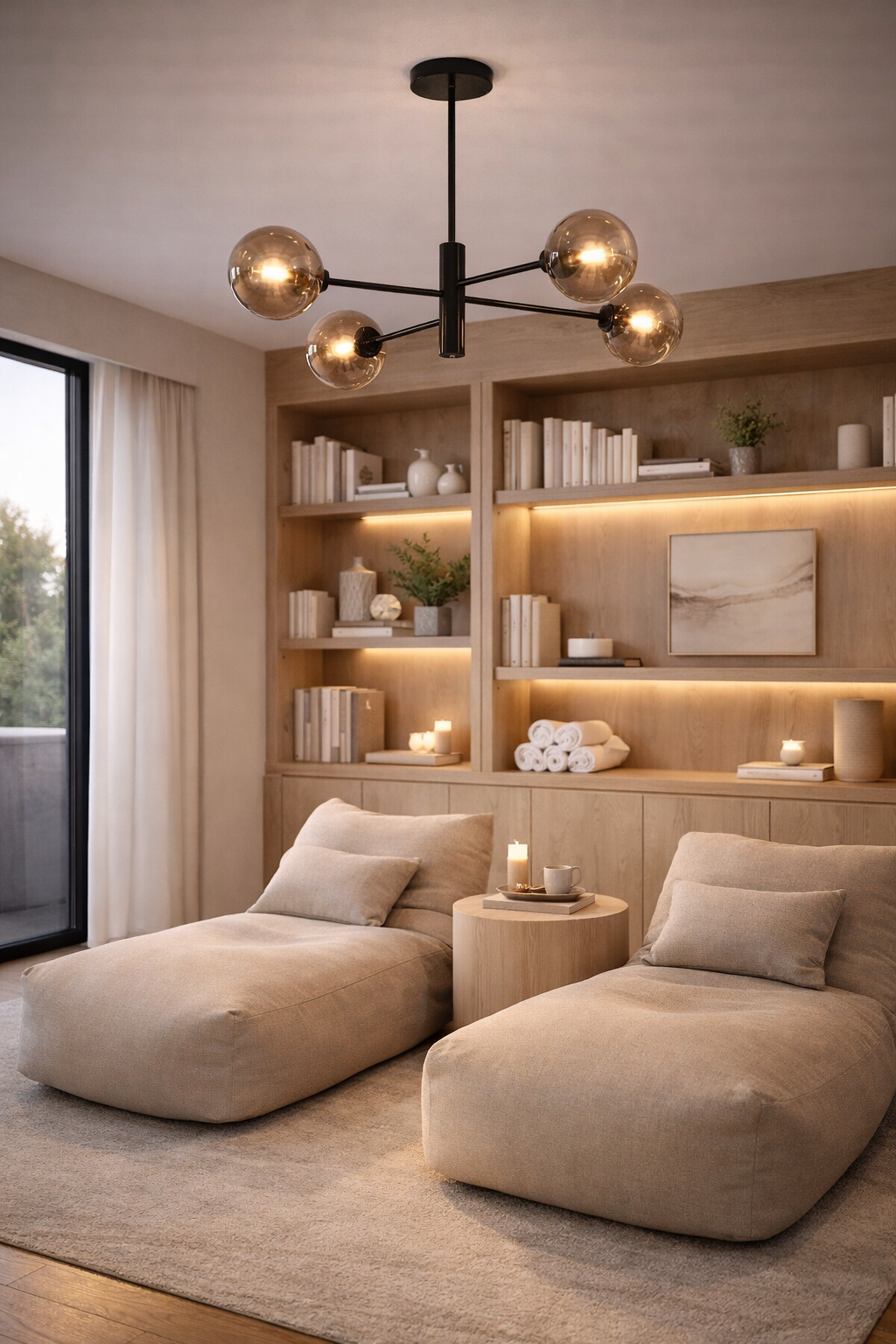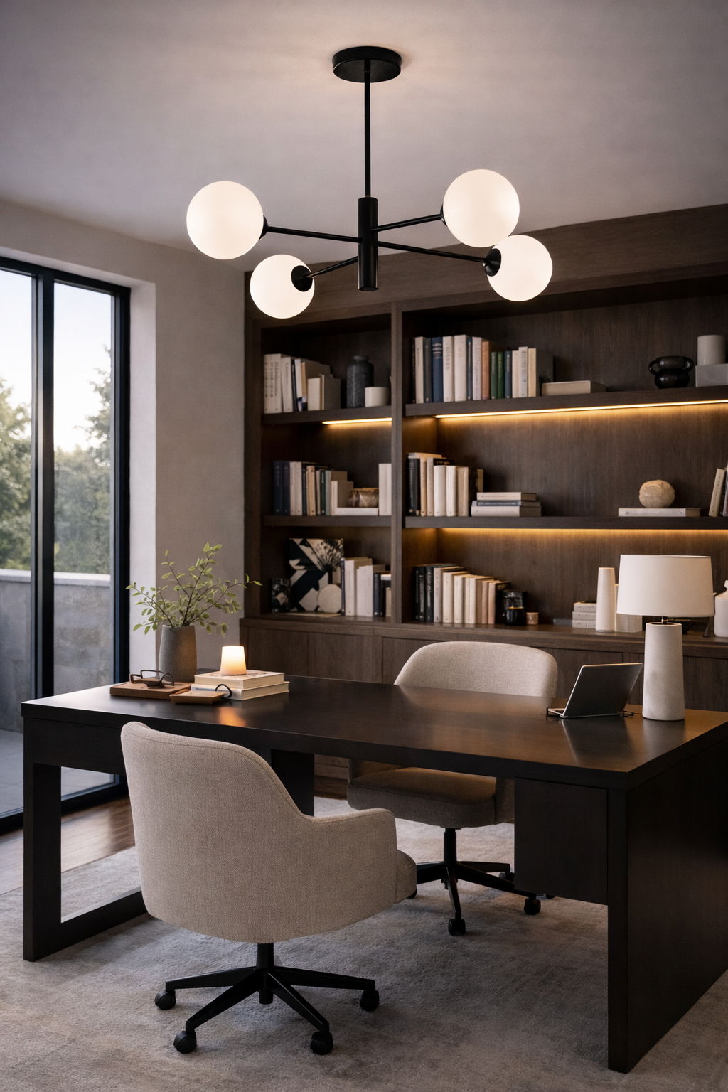 This modern chandelier features a sleek black metal frame with four spherical glass shades arranged in a clean, balanced design. The opal white glass provides soft, even illumination, while the amber glass option creates a warmer, atmospheric glow. Its minimalist silhouette makes it ideal for dining rooms, living spaces, and contemporary interiors. Designed to be both functional and decorative, it adds a refined statement without overwhelming the space.