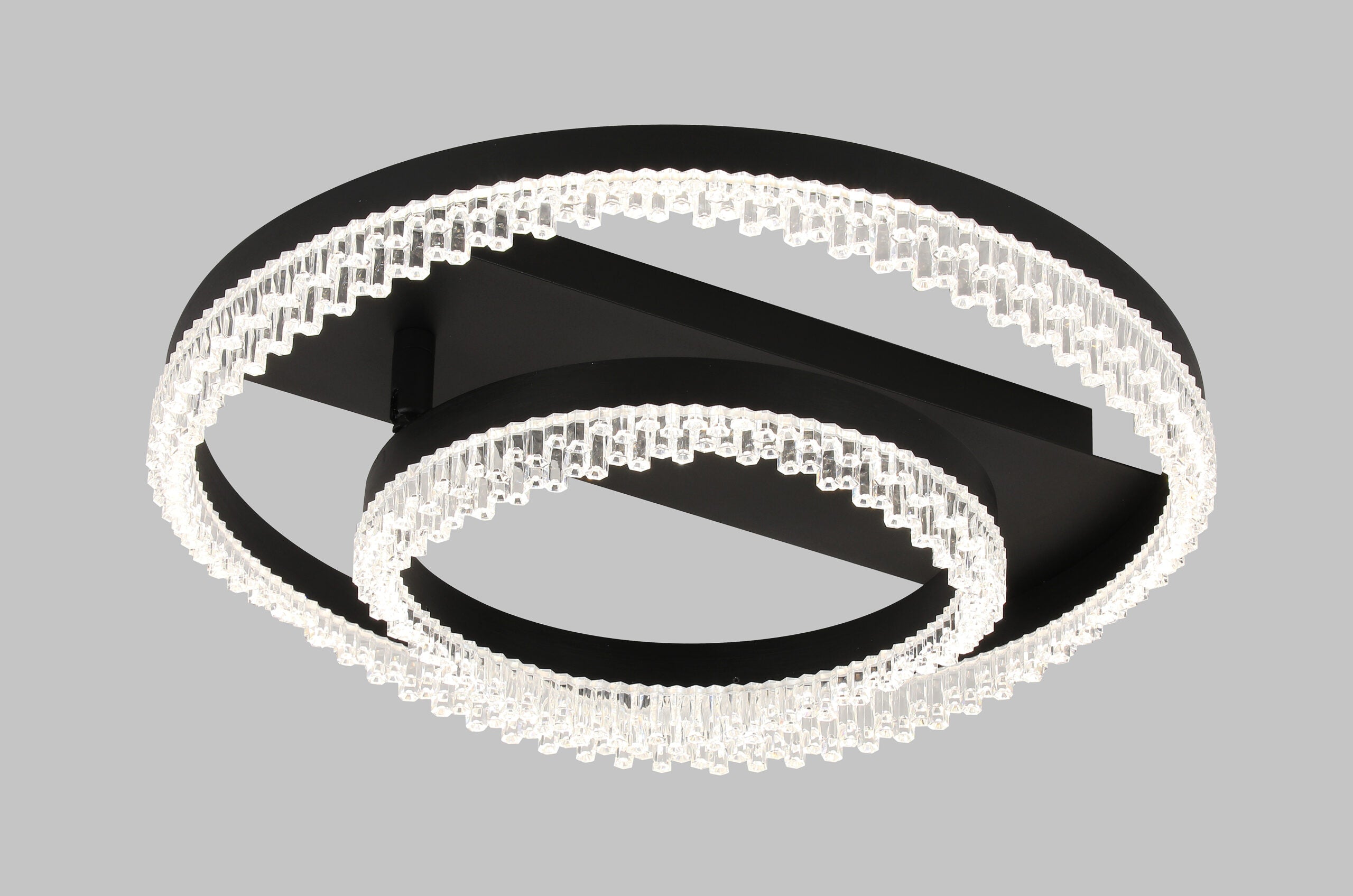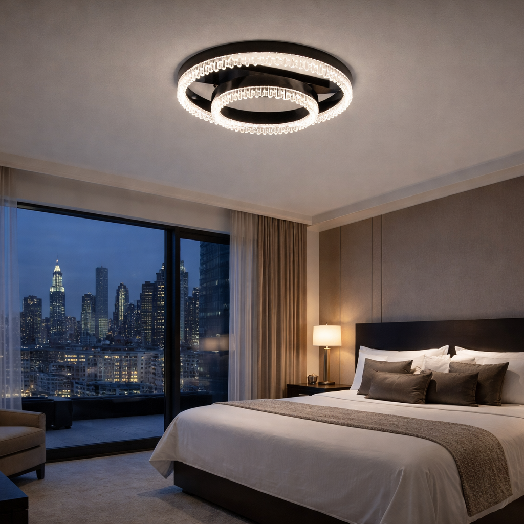 This elegant circular ceiling light features a layered ring design enhanced with finely detailed crystal elements, creating a refined and luxurious glow. Available in multiple finishes, it seamlessly adapts to a range of interiors from modern minimal to high-end contemporary spaces. The integrated light provides bright, energy-efficient illumination with a soft, evenly diffused effect. Its sculptural form adds depth and visual interest, making it both a functional light and a statement feature. Perfect for living areas, bedrooms, or entryways, it delivers a sophisticated balance of style and performance.