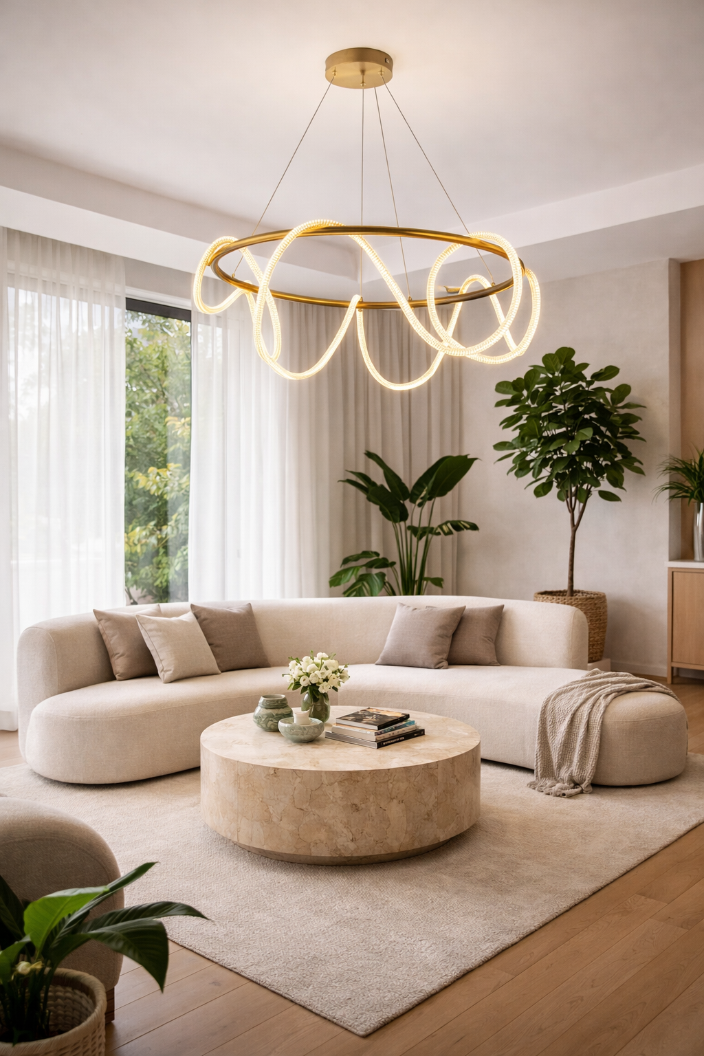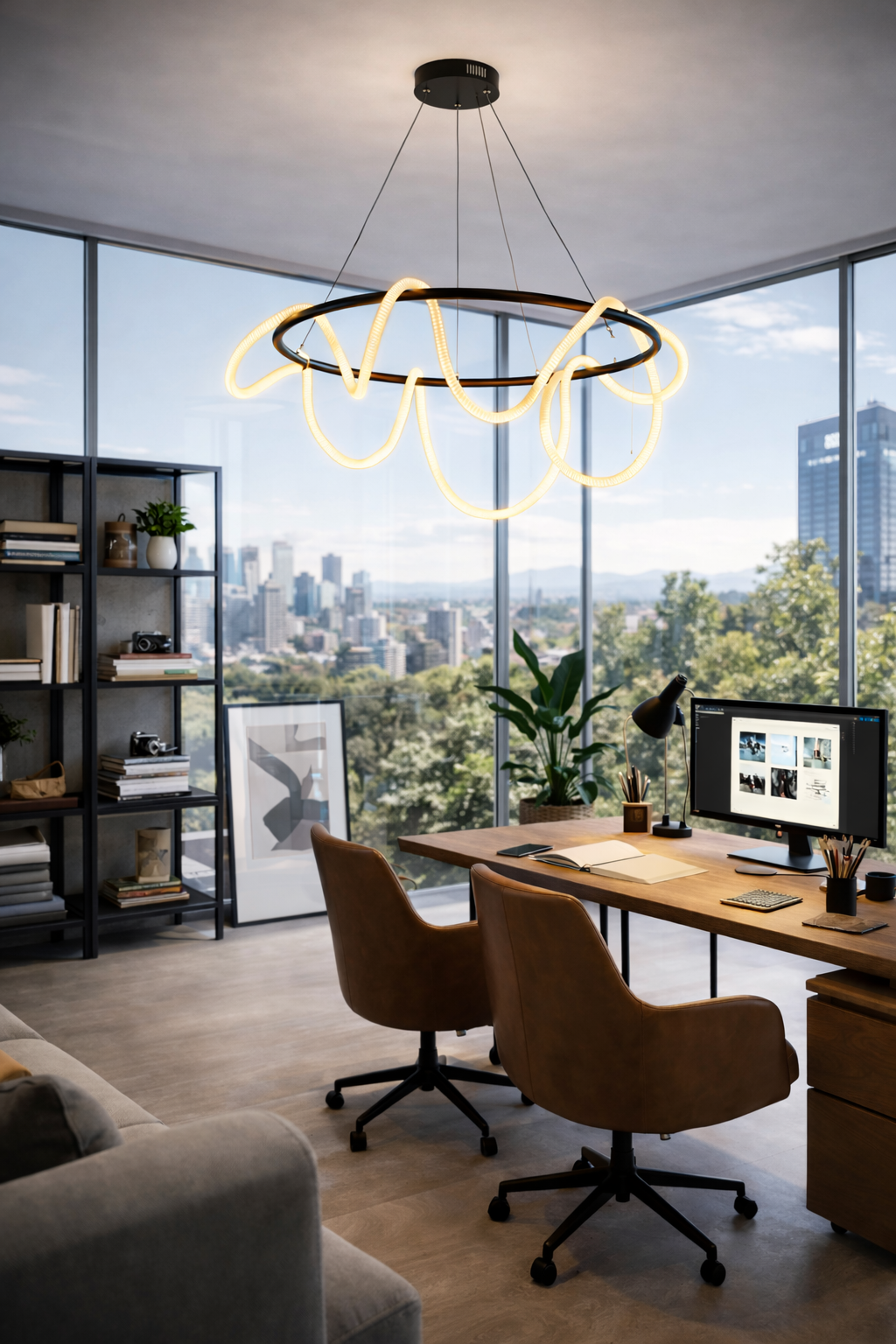 This contemporary pendant features a ring wrapped with flowing rope-style LED, creating a sculptural and artistic statement. It suits modern, industrial, and contemporary interiors beautifully. Perfect for dining rooms, stair voids, open-plan living areas, or creative commercial spaces. The organic curves soften architectural spaces while adding visual movement. It makes a room feel dynamic, sophisticated, and architecturally striking.