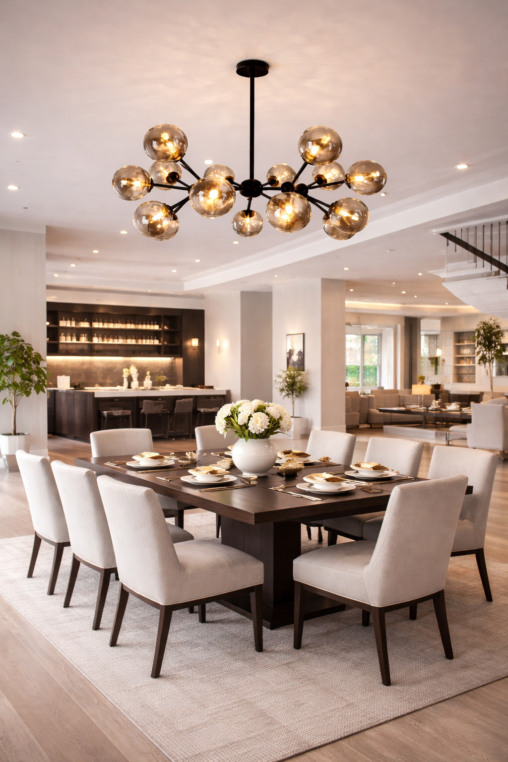 This striking pendant features a sculptural, multi-arm design that creates a balanced and eye catching display of light. Its globe arrangement casts a warm, ambient glow while adding strong visual interest to the space. Perfect for dining rooms, kitchen islands, or statement living areas, it brings a sense of modern luxury without feeling heavy or overpowering. The design transforms any room into a refined focal point with both style and atmosphere.