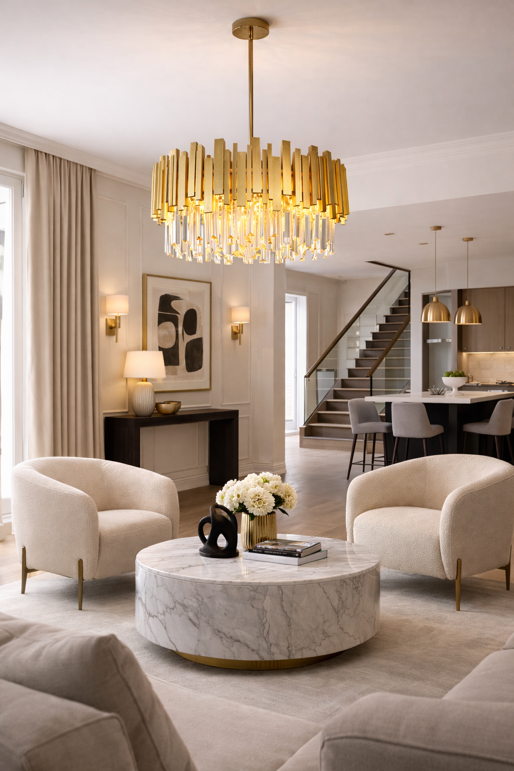 This striking gold chandelier is a true statement piece, combining sculptural vertical metal detailing with cascading crystal elements that catch and reflect the light beautifully. Its layered design creates depth and movement, while the warm glow adds richness and ambience to any space. Perfect for formal sitting rooms, grand dining areas, or elegant entry voids, it instantly elevates the atmosphere with a sense of refined luxury. The brushed gold finish brings warmth and sophistication without feeling overpowering.